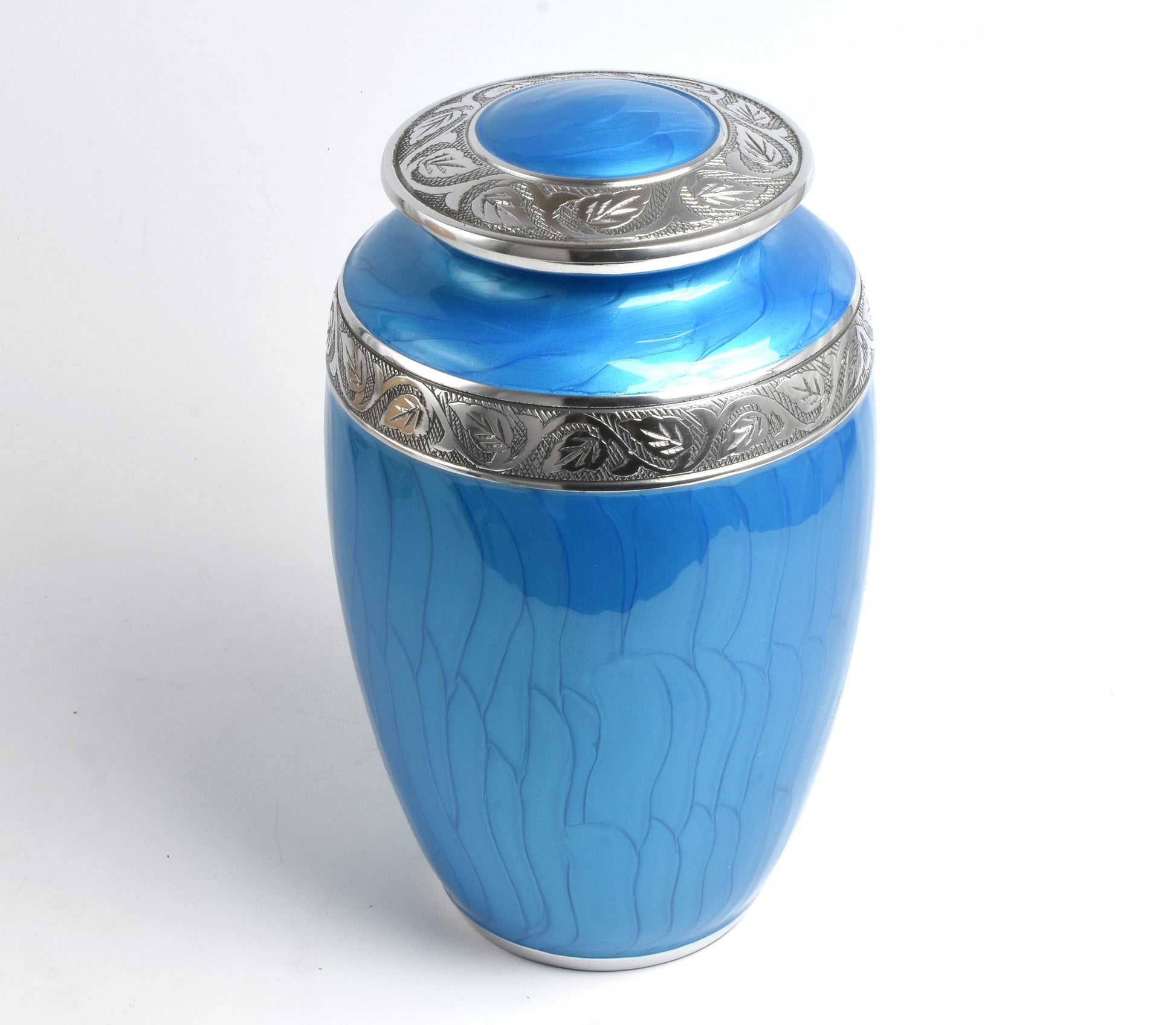 Honour your loved one with the timeless beauty of the Classic Blue and Silver Adult Large Cremation Ashes Urn. This elegant urn, crafted from premium aluminium with a hand-cast blue resin enamel finish, provides a dignified and lasting memorial. Each urn is meticulously created by skilled artisans, ensuring the highest quality at an accessible price.