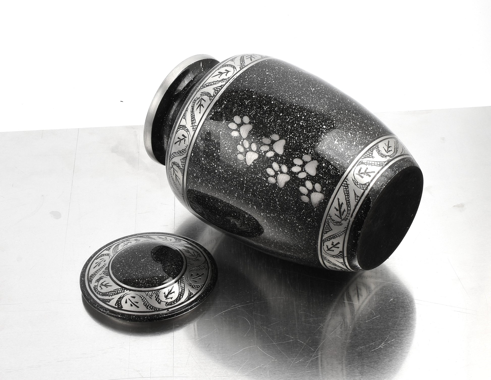 Our Classic Black and Silver Paw Cremation Urn is hand-made and designed by skilled artisans from the premium quality solid aluminium. Ashes of your loved one are safely preserved in this urn in a peaceful and dignified manner via threaded lid at the top.
