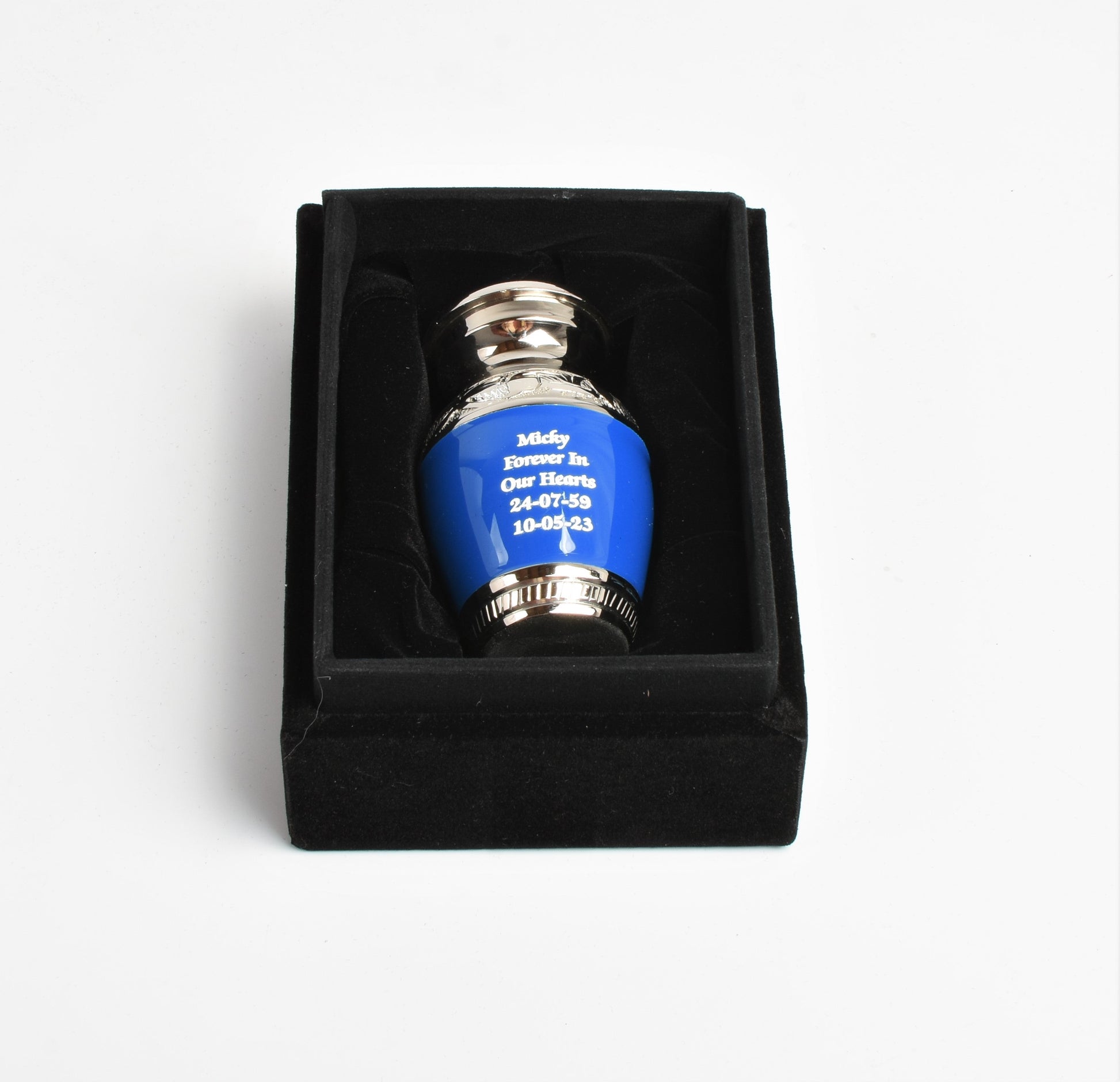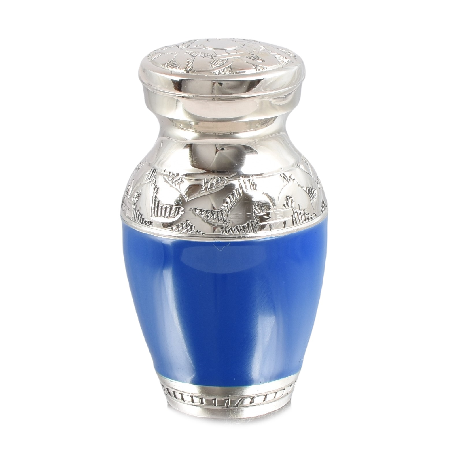 Blue Mini Keepsake Urn with Silver (Nickel) Design Presented In A Velvet Box - A beautiful piece of art work hand crafted by skilled artisans.