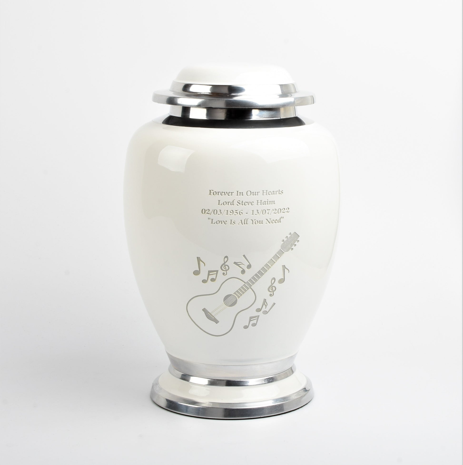 White and Silver Guitar and Music Notes Design Cremation Urn - Hand Made