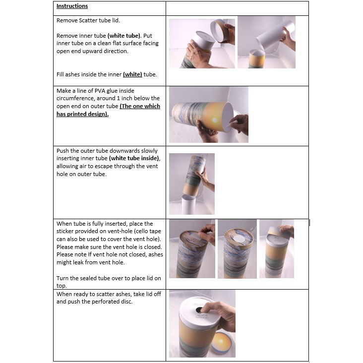 This scatter tube is specifically designed for scattering ashes/cremated remains on land / in water and also can be used for storing ashes safely, it is also suitable to transfer ashes on a plane due to it being made of card board/paper only. This cardboard scattering tube is durable, dignified and simple to use.
