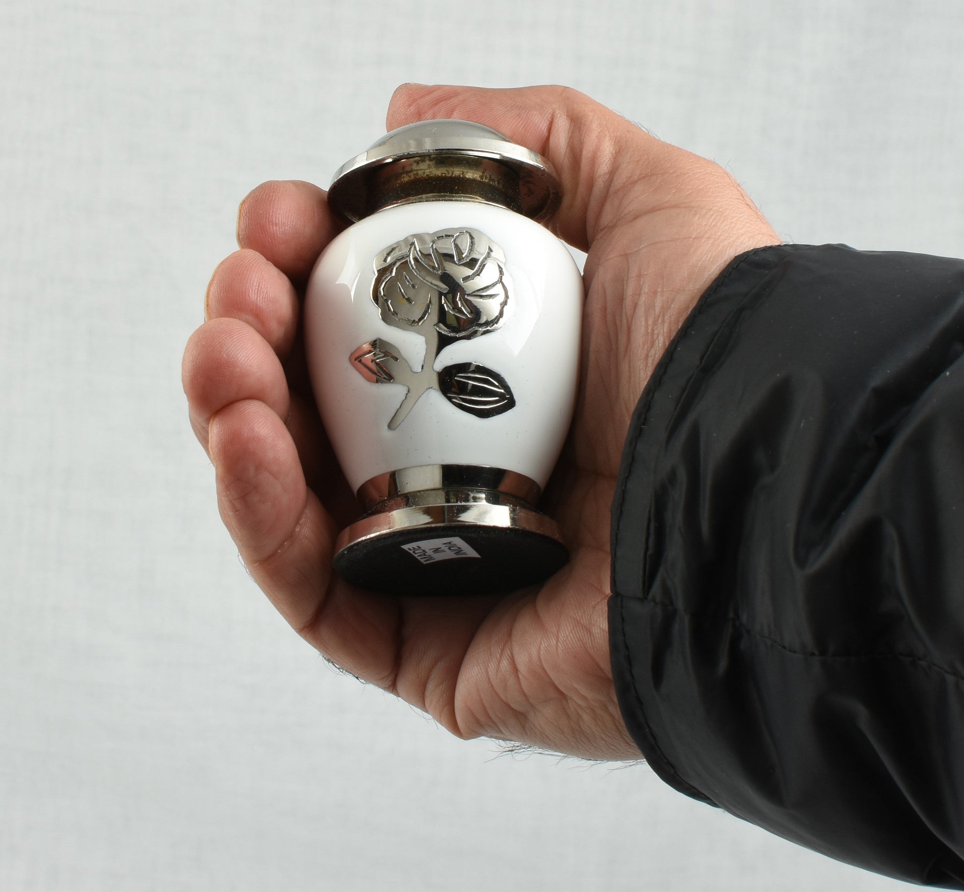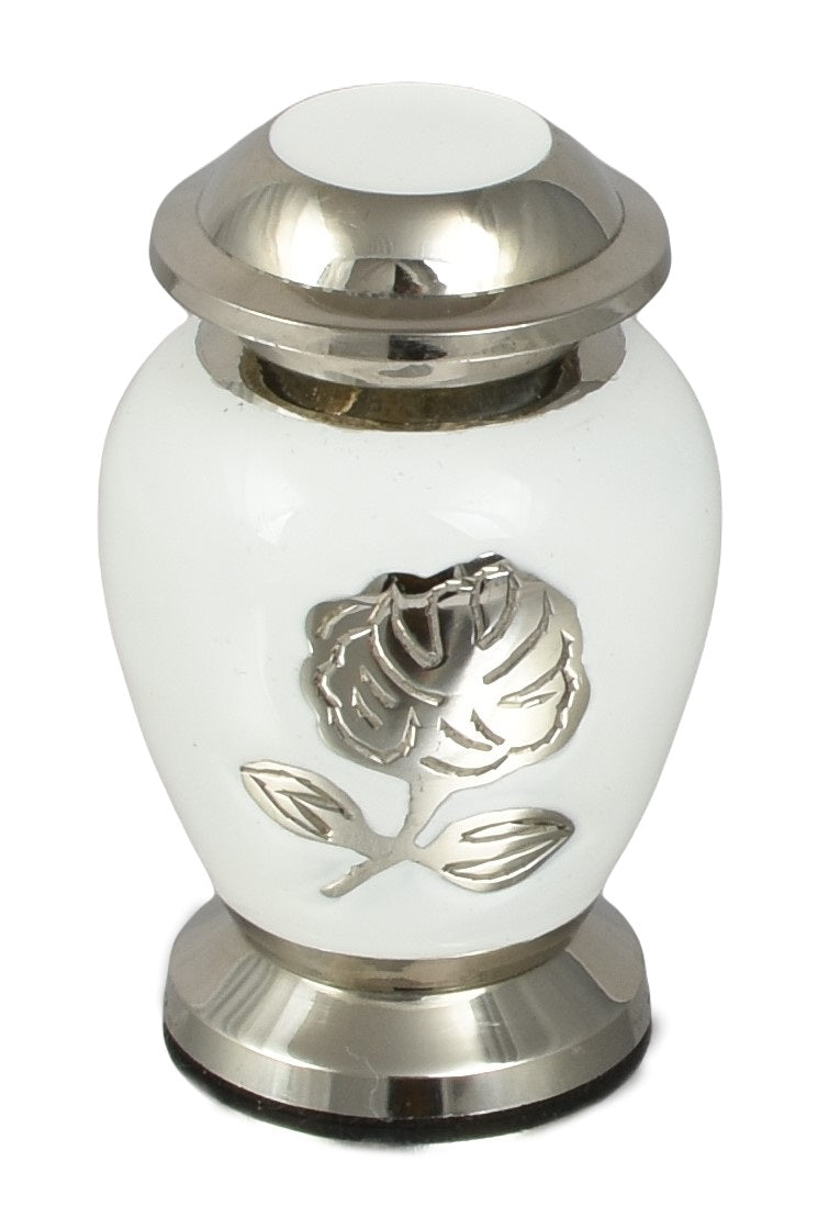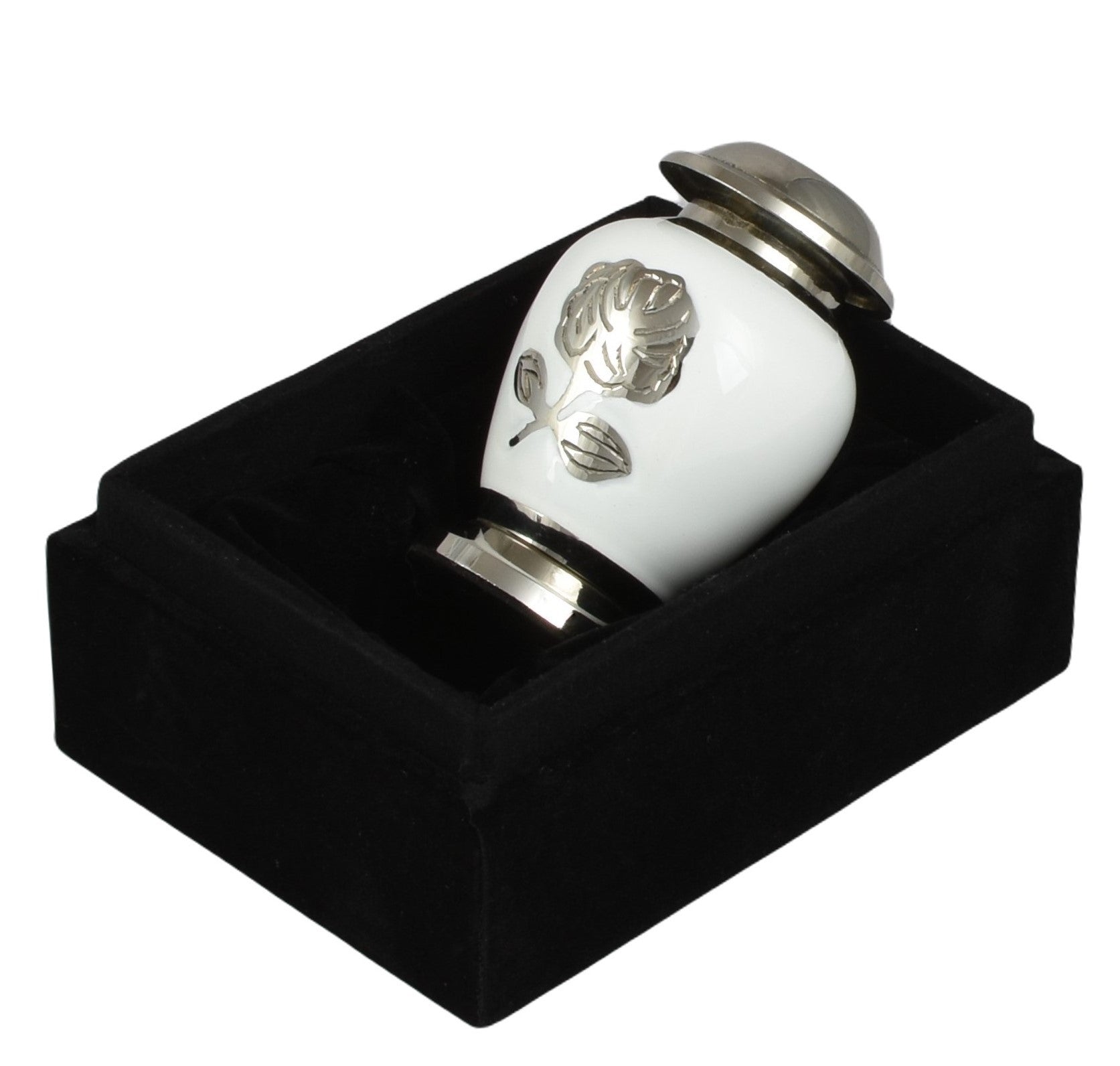 Silver rose On White & Silver Mini Keepsake Urn Presented In A Velvet Presentation Box - A beautiful piece of art work hand crafted by skilled artisans.