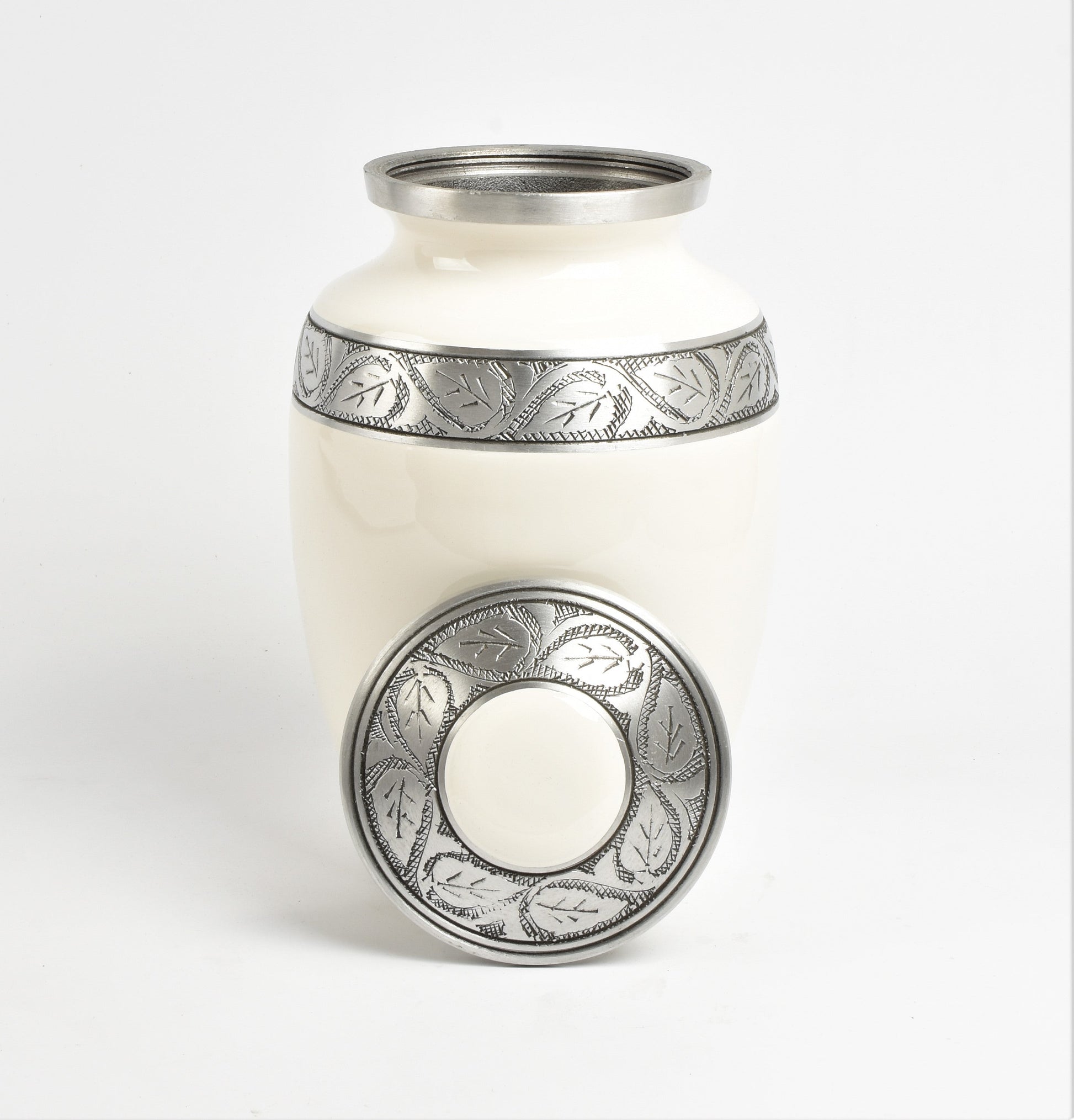 Our Classic Solid White and Silver Cremation Urn is hand-made and designed by skilled artisans from finest quality of solid brass. This urn measures approximately 5.5" High and suitable to hold cremated ashes of a child , part ashes of an adult or a pet. Ashes of your loved one are safely preserved in this urn in a peaceful and dignified manner via threaded lid at the top.