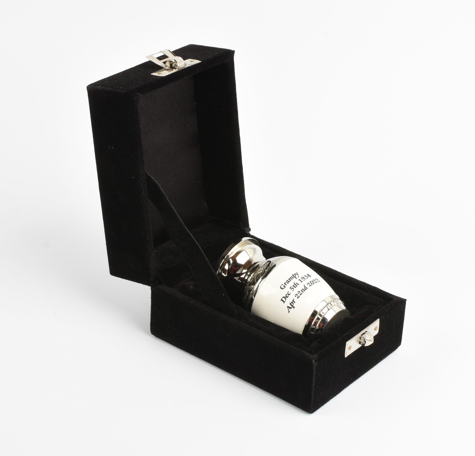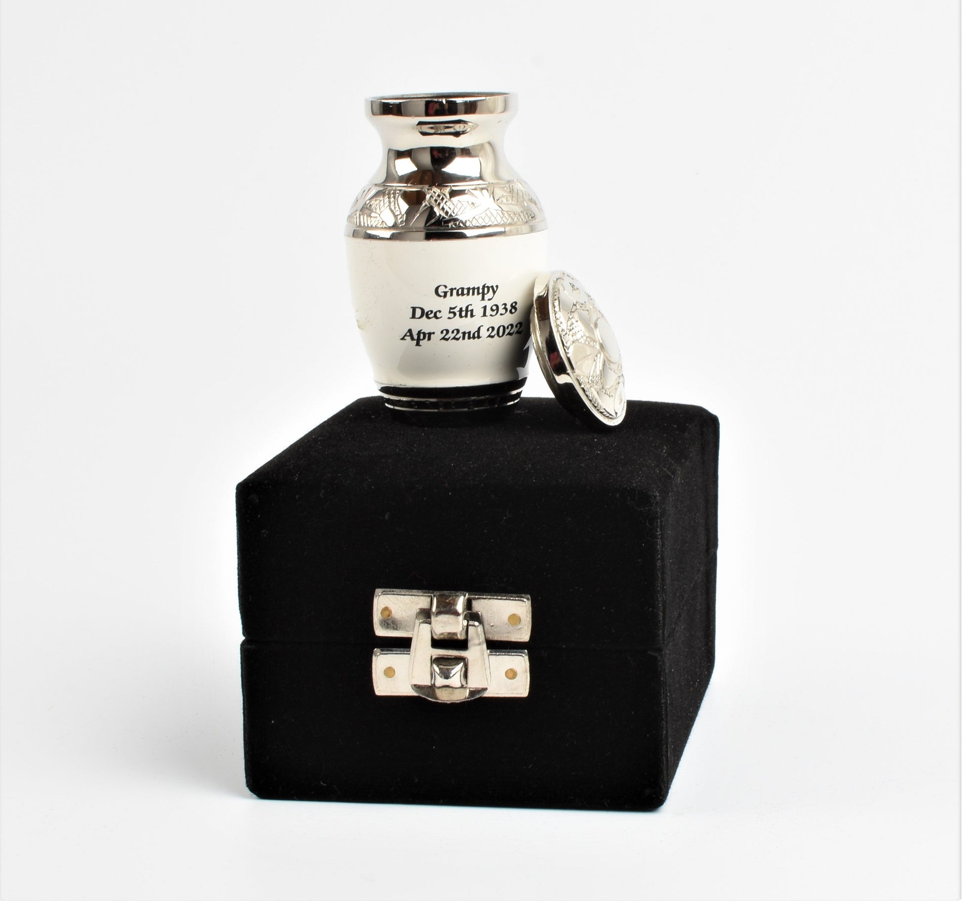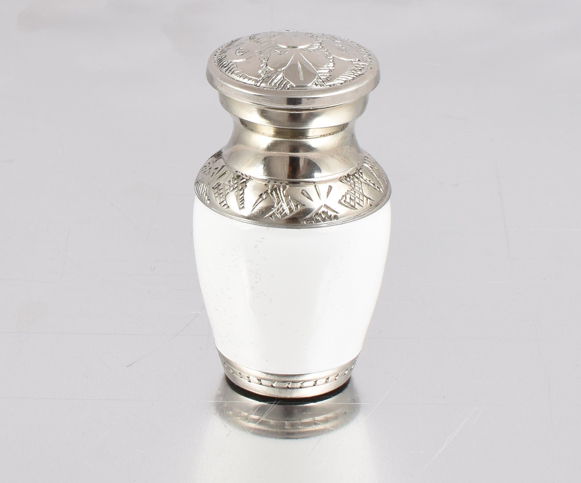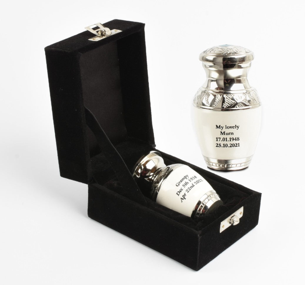 Pearl White Mini Keepsake Urn with Silver Design Presented In A Velvet Box - A beautiful piece of art work hand crafted by skilled artisans.