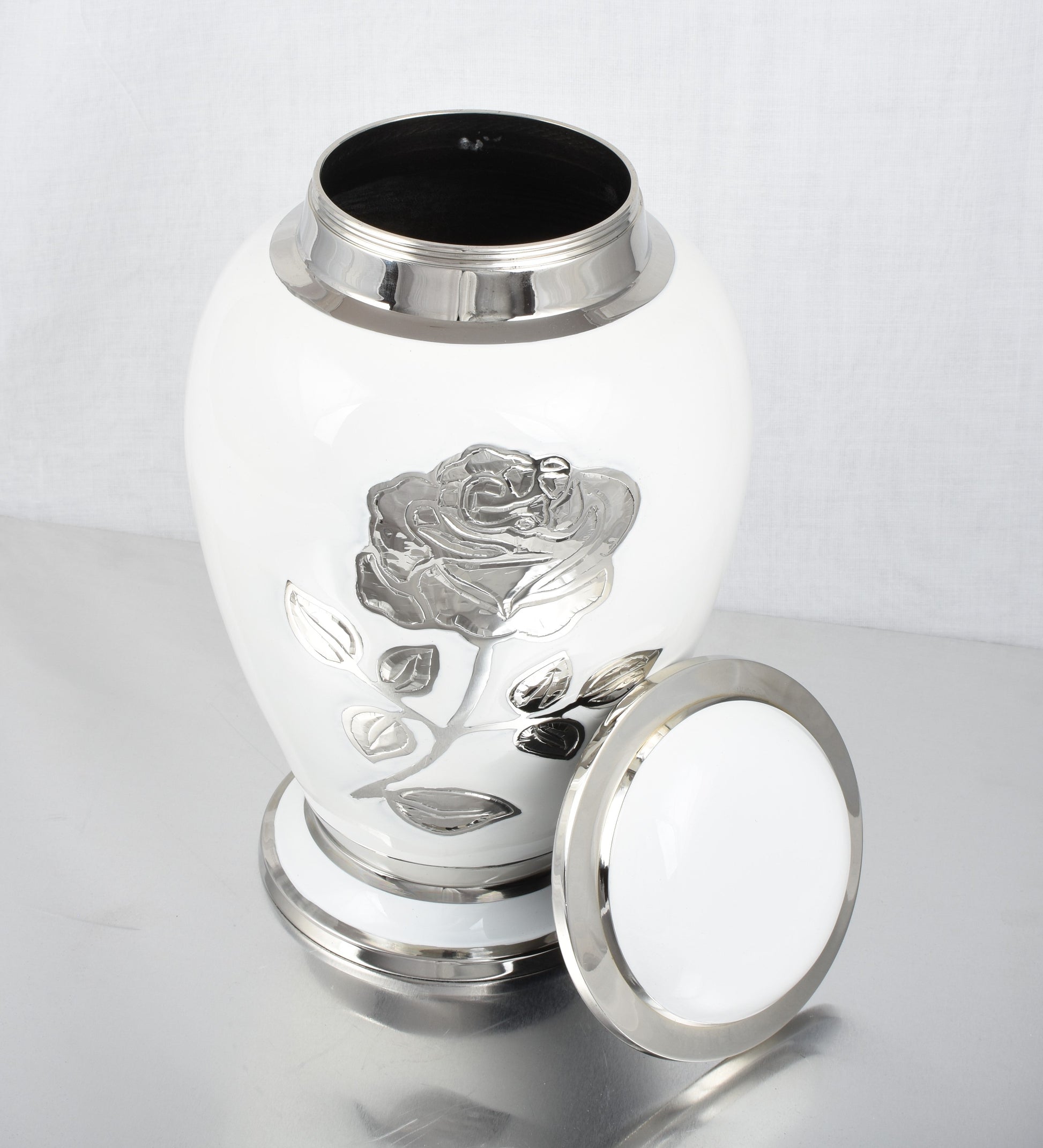 White Cremation Urn With Silver (Nickel) Rose Flower Design - Hand Made